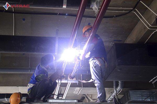 Hệ thống phòng cháy chữa cháy được công nhân thi công rất cẩn thận.
