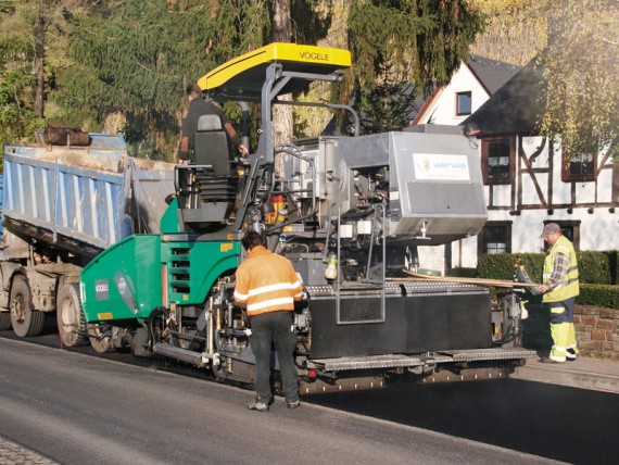 Brodenbach is located in an area of Rhineland-Palatinate known as the “Terassenmosel” (terraced slopes along the river Moselle) in the district of Mayen-Koblenz, about 26km south of Koblenz. The B 49 federal road runs straight through this popular tourist resort. It offers travellers a picturesque view of the river Moselle. However, long years of heavy traffic and patchwork repairs had taken a heavy toll, leaving the road in urgent need of pavement rehabilitation. At the same time, the work had to proceed without unduly impairing tourist traffic; for this reason, only one lane could be closed to traffic at any one time.